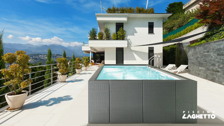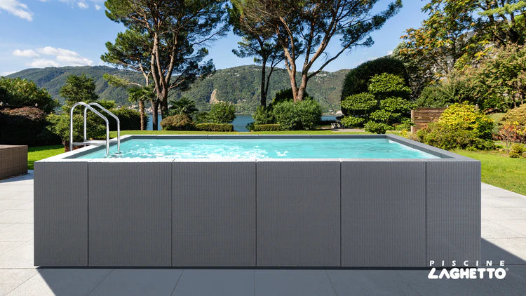 El Dolcevita Diva es la piscina desmontable más elegante de su categoría: diseño sofisticado, equipamiento flexible y un confort excepcional. Con ratán trenzado a mano en color gris o blanco, se integra de manera armónica en cualquier jardín de alto nivel.